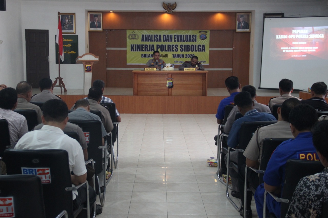 Dalam rangka analisa dan evaluasi kinerja Polres Sibolga di tahun 2020, Kapolres Sibolga AKBP Triyadi, SH, SIK pimpin anev situasi kamtibmas yang bertempat di Aula Wira Pratama Polres Sibolga, pada Kamis (13/02).