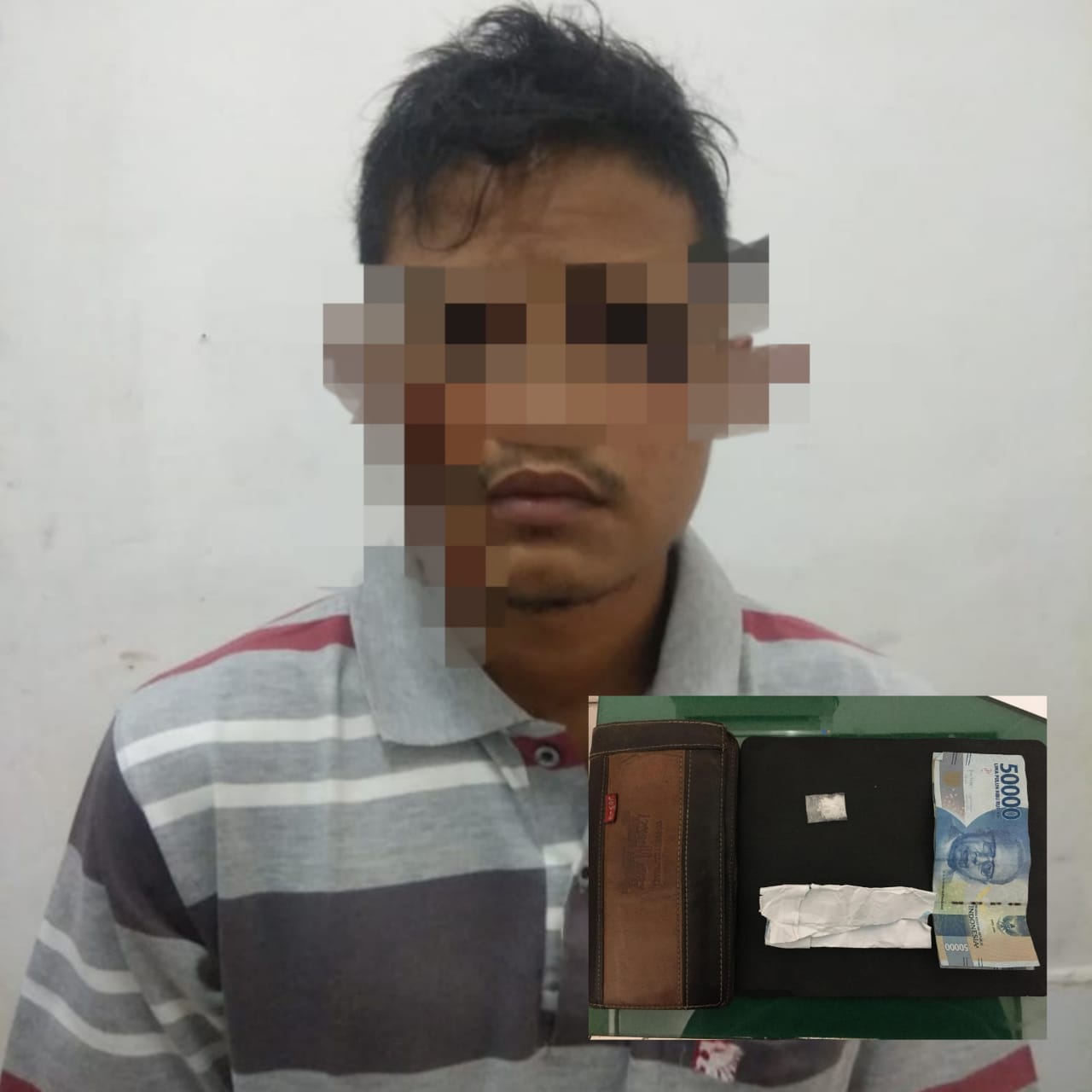 Menyikapi hal tersebut selanjutnya petugas langsung melakukan penindakan dan pendalaman informasi, tidak berapa lama petugas berhasil mengamankan tersangka tersebut beserta barang bukti 1 bungkus kecil serbuk kristal putih terbungkus plastik bening.