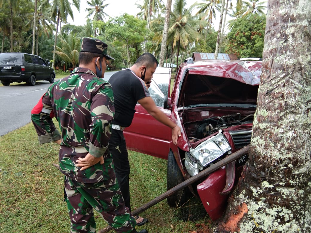 Keterangan yang dihimpun News24jam.com menyebutkan, mobil tersebut menghantam satu batang pohon kelapa yang mengakibatkan mobil tersebut ringsek. Peristiwa kecelakaan ini terjadi jam 05.00 Wib, Minggu (31/05)