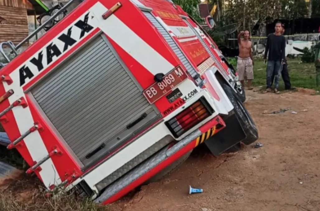 Akibatnya dua unit mobil Damkar bernomor polisi BB 8069 M, dan BK 9821 M itu tampak terperosok ke parit yang tidak jauh dari lokasi kebakaran.