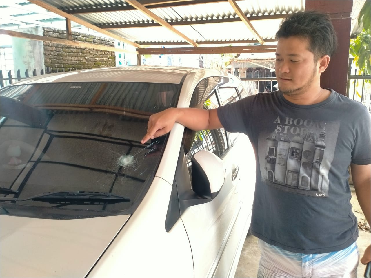 Diduga terkena peluru nyasar, satu unit mobil Avanza Veloz luxury berwarna putih bernomor polisi BB 1753 NA mengalami pecah kaca dibagian kiri depan mobil saat terparkir diteras rumah.