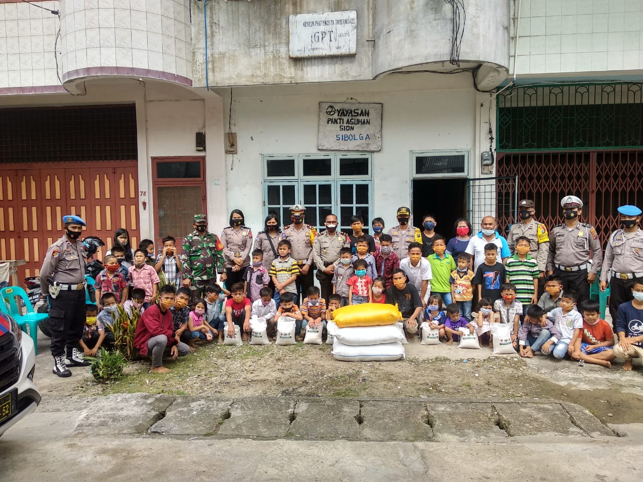 Personil Kepolisian Resort (Polres) Sibolga, Sumatera Utara (Sumut), melakukan anjangsana sekaligus memberikan bantuan kepada anak-anak di Yayasan Sion di Jalan Albertus, Kelurahan Pasar Baru, Kecamatan Sibolga Kota, Kota Sibolga, Senin (28/12).