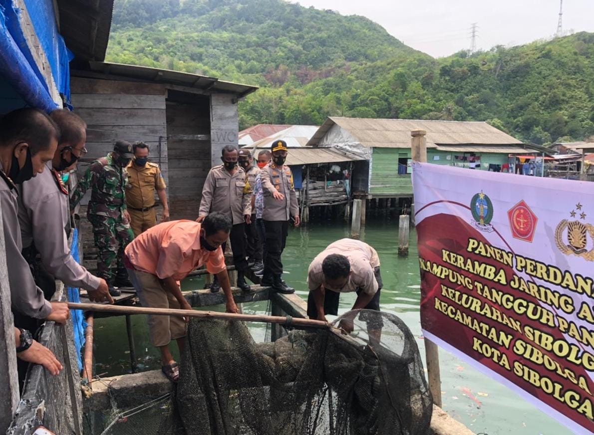 Kapolres Sibolga, AKBP Triyadi, bersama Personil Polres dan jajaran Pemerintah Kota Sibolga Panen ikan Perdana Kerambah Jaring Apung di Kampung ‘Tangguh’ di Panomboman, Kelurahan Sibolga Ilir, Kecamatan Sibolga Utara, Kota Sibolga, pada Rabu (10/3/2021).