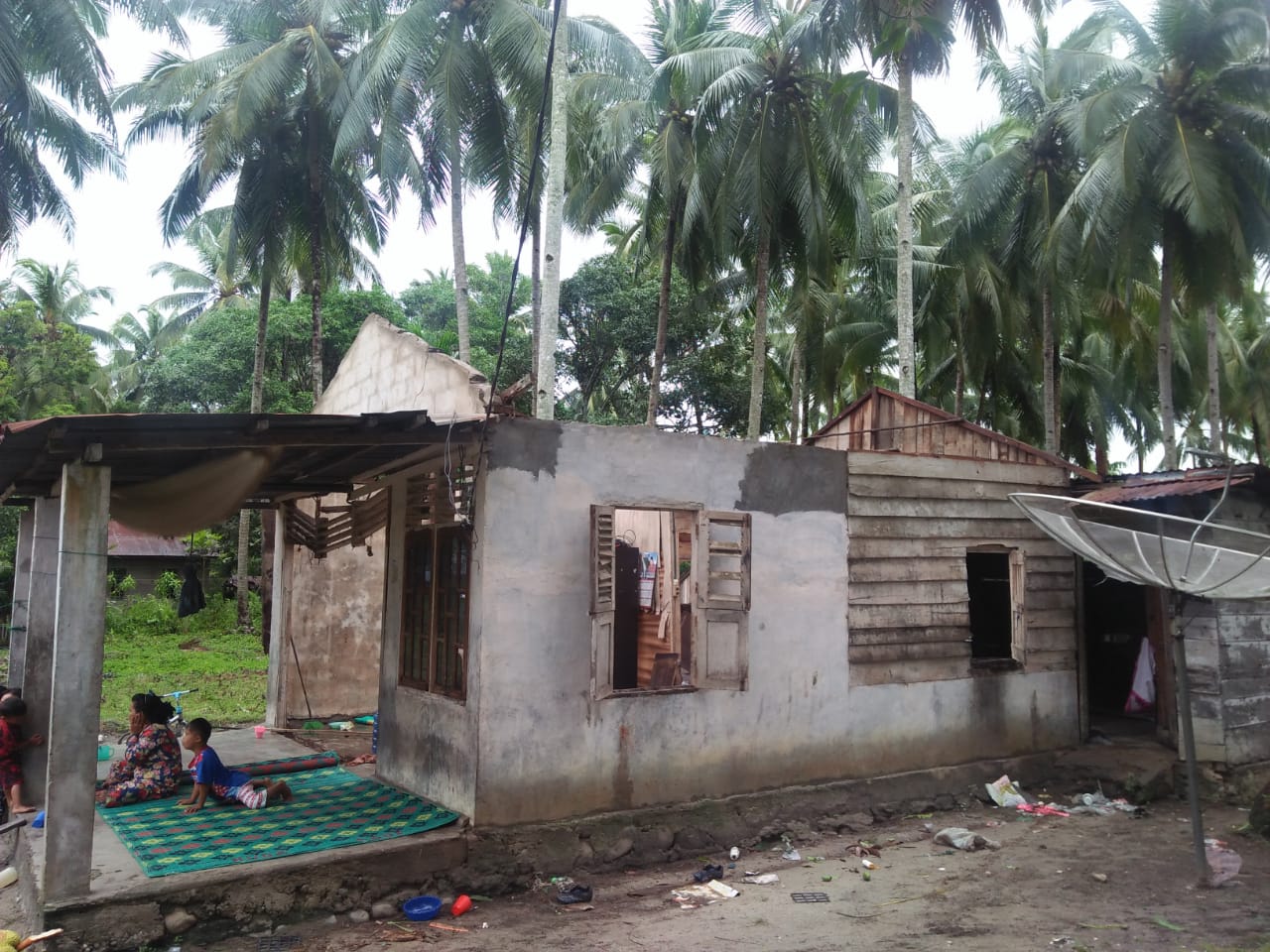 “Malam itu tidak ada hujan, dan saya lihat kondisi cuaca pun terang bulan, kemudian sayapun beserta keluarga tidur, tetapi pada saat sepanjang kami tidur tiba-tiba saja kami terbangun serta terkejut, rupanya angin yang sangat kencang disertai hujan telah merusak seluruh atap seng rumah kami mulai dari teras rumah sampai dapur. Alhamdulillah untung saja ada satu lembar triplek yang melindungi kami dari kepingan kayu yang jatuh dari atap seng itu,” terang Eka.