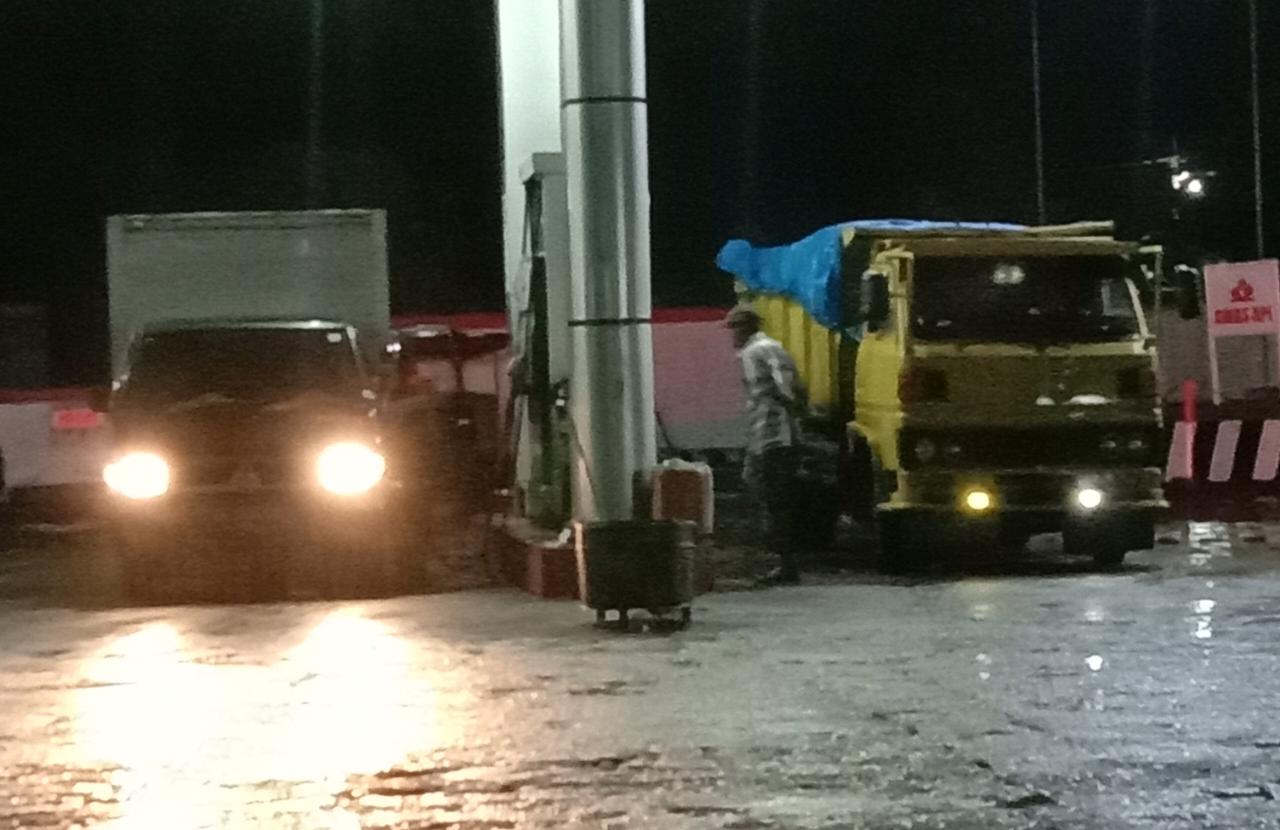 Di SPBU Kecamatan Sarudik, Jum’at (3/4), terlihat mobil dump truk yang diduga berisikan Polytank ditutupi dengan terpal warna biru sedang melakukan pengisian BBM jenis solar. Menghindari antrean, pengisian dilakukan secara berulang-ulang bolak balik masuk ke SPBU tersebut.