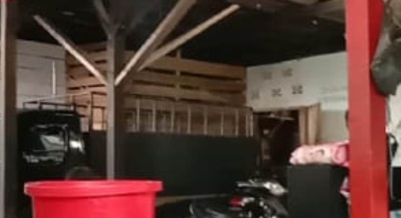Proses pemindahan minyak dari dalam drum terlihat menggunakan selang/pompa yang diduga langsung tersambung ke Polytank yang berada di dalam gudang.