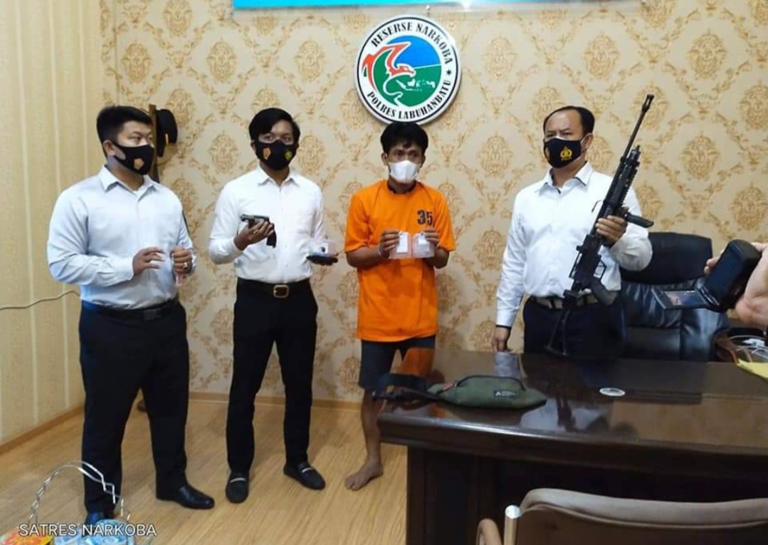 “Saat ditangkap dari tangan pelaku polisi berhasil mengamankan barang bukti berupa 1 bungkus sabu seberat 0,18 gram, 1 bungkus sabu seberat 0,12 gram, Uang Tunai sebesar Rp. 700.000, 1 buah tas pinggang, 3 bungkus plastik klip tembus pandang yang masing – masing berisikan plastik klip kecil tembus pandang, 1 buah kotak senter, 1 Unit timbangan, 1 pucuk senjata laras panjang rakitan dan 1 pucuk senjata laras pendek rakitan,” kata Kapolres Labuhanbatu AKBP Deni Kurniawan saat menggelar konferensi press terkait penangkapan tersangka engedar narkoba bersenjata Rakitan. Senin (23/08/2021).
