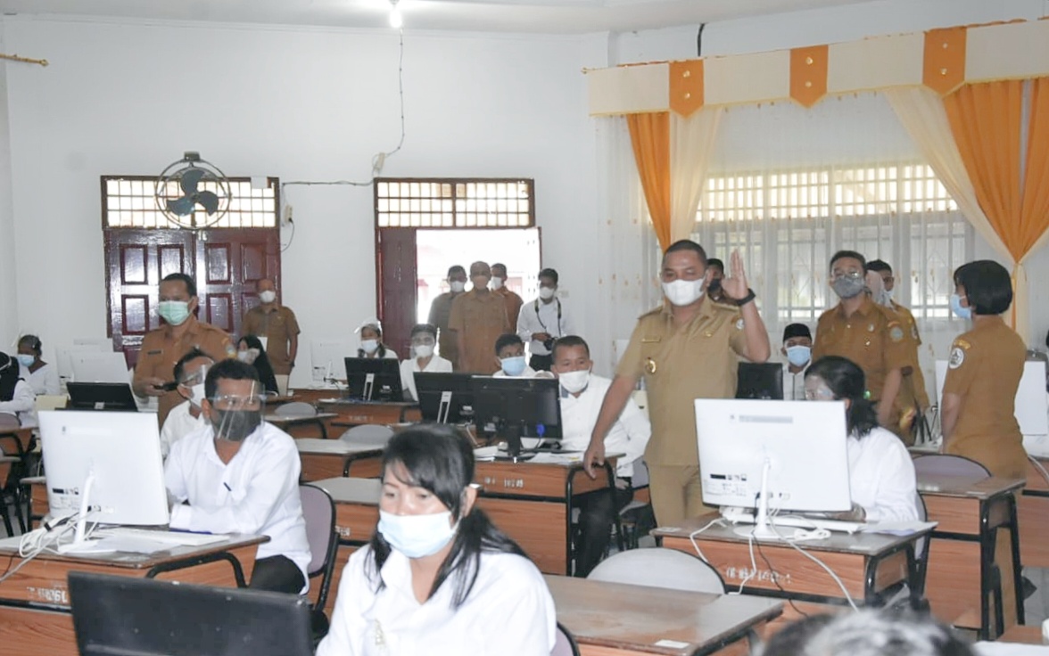 Bupati Tapanuli Tengah Bakhtiar Ahmad Sibarani meninjau langsung pelaksanaan seleksi (Ujian) Aparatur Sipil Negara (ASN) Pegawai Pemerintah dengan Perjanjian Kerja (PPPK) Jabatan Fungsional Guru Tahun 2021 Tahap I yang dilaksanakan di SMA Negeri 1 Plus Matauli Pandan, Senin (13/09/2021).