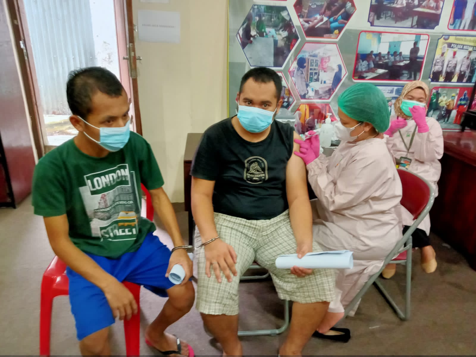 Dengan pengawalan oleh petugas Reskrim, sebanyak 10 orang yang sedang menjalani masa tahanan di Rumah Tahanan (Rutan) Polsek Medan Baru mendapat layanan vaksinasi oleh Tenaga Kesehatan dari RS Anugerah Ibu.