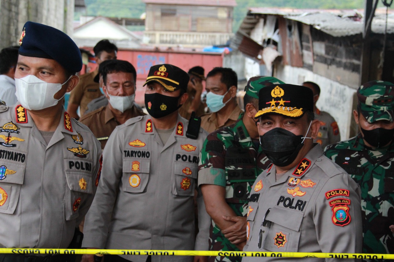 Kepala Kepolisian Daerah (Kapolda) Sumatera Utara (Sumut) Irjen Pol RZ Panca Putra Simanjuntak meninjau lokasi ledakan di salah satu tangkahan ikan di Jalan KH Ahmad Dahlan, Kelurahan Pancuran Bambu, Kecamatan Sibolga Sambas, Senin (24/1/2022).
