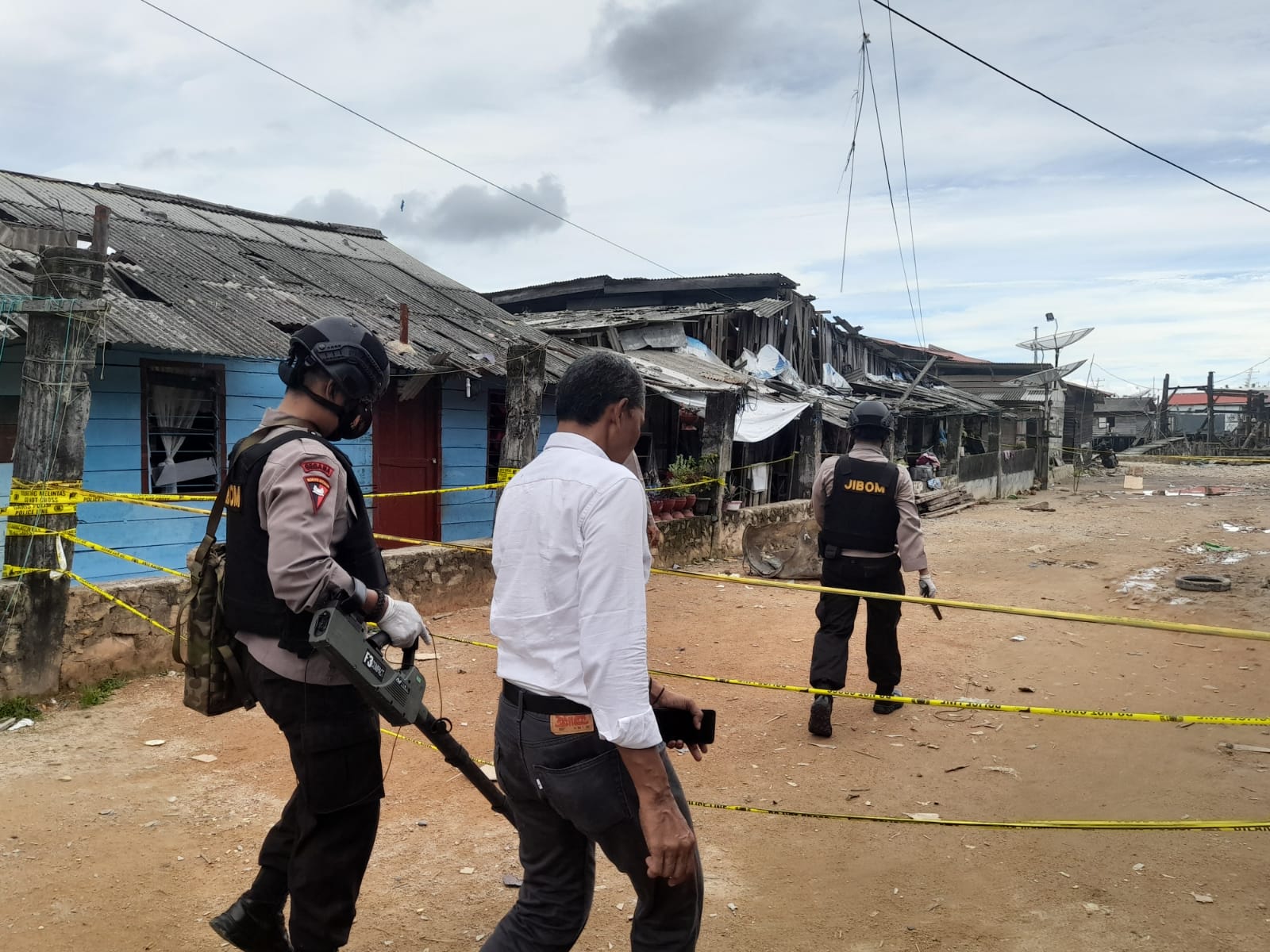 Pasca terjadinya ledakan di Tangkahan Beringin di Jalan K.H A. Dahlan, Kelurahan Pancuran Bambu, Kecamatan Sibolga Sambas, Sibolga. Tim Satuan Unit Jibom Gegana Brimob Polda Sumut bersama Tim laboratorium forensik (Labfor) terjun kelokasi.