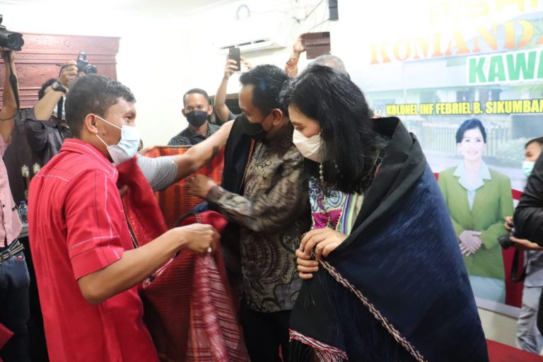 Pada kesempatan ini, Wabup Tonny memberikan ulos kepada pejabat Danrem lama Febriel Buyung Sikumbang beserta isteri.