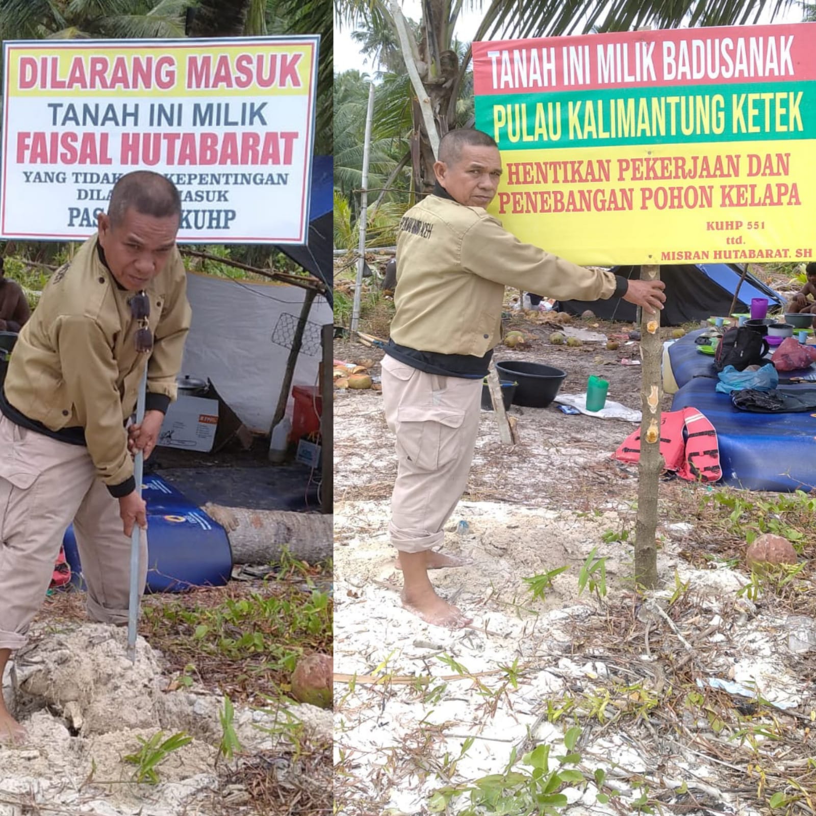 “Saya juga merasa sedih dan menangis ketika sesampainya di Pulau Kalimantung Kecil, terlihat terpampang Plank Yang bertuliskan milik pribadi inisial FH. Padahal Pulau Kalimantung Kecil itu banyak ahli Waris yang berhak. Selanjutnya saya kitari sekeliling Pulau Kalimantung Kecil banyak pohon kelapa yang telah ditebangi, kalau saya hitung berkisaran lebih kurang 100 batang,” ucapnya.