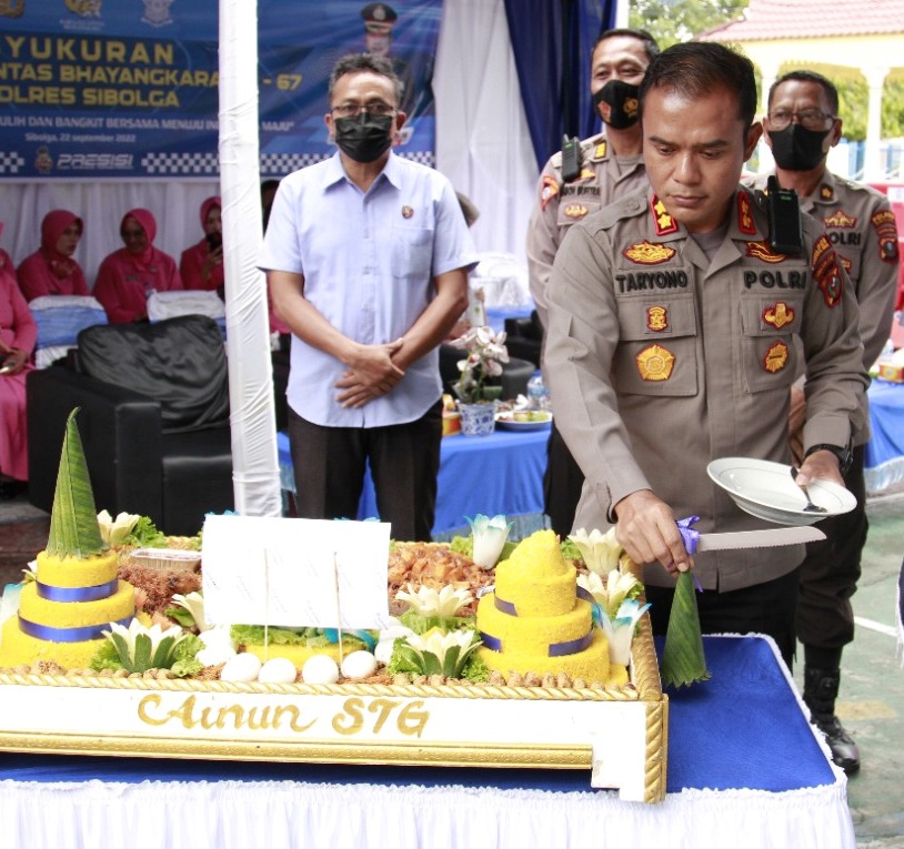 Acara diakhiri dengan pemotongan nasi tumpeng oleh Kapolres Sibolga dan Kadis Hub kota Sibolga yang diserahkan kepada anggota jajaran Polres Sibolga yang paling senior Aiptu Ramot Sirait dan junior Bripda Aulia.