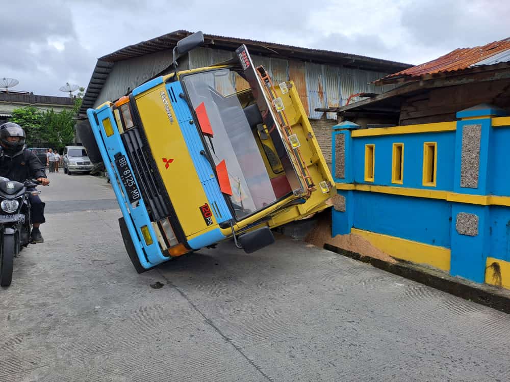 Truk bernomor BB 8125 MD yang sedang mengangkut pasir tersebut rencananya akan membuang muatannya kesalah satu rumah warga. Namun, jalan yang dilewati truk tersebut amblas.