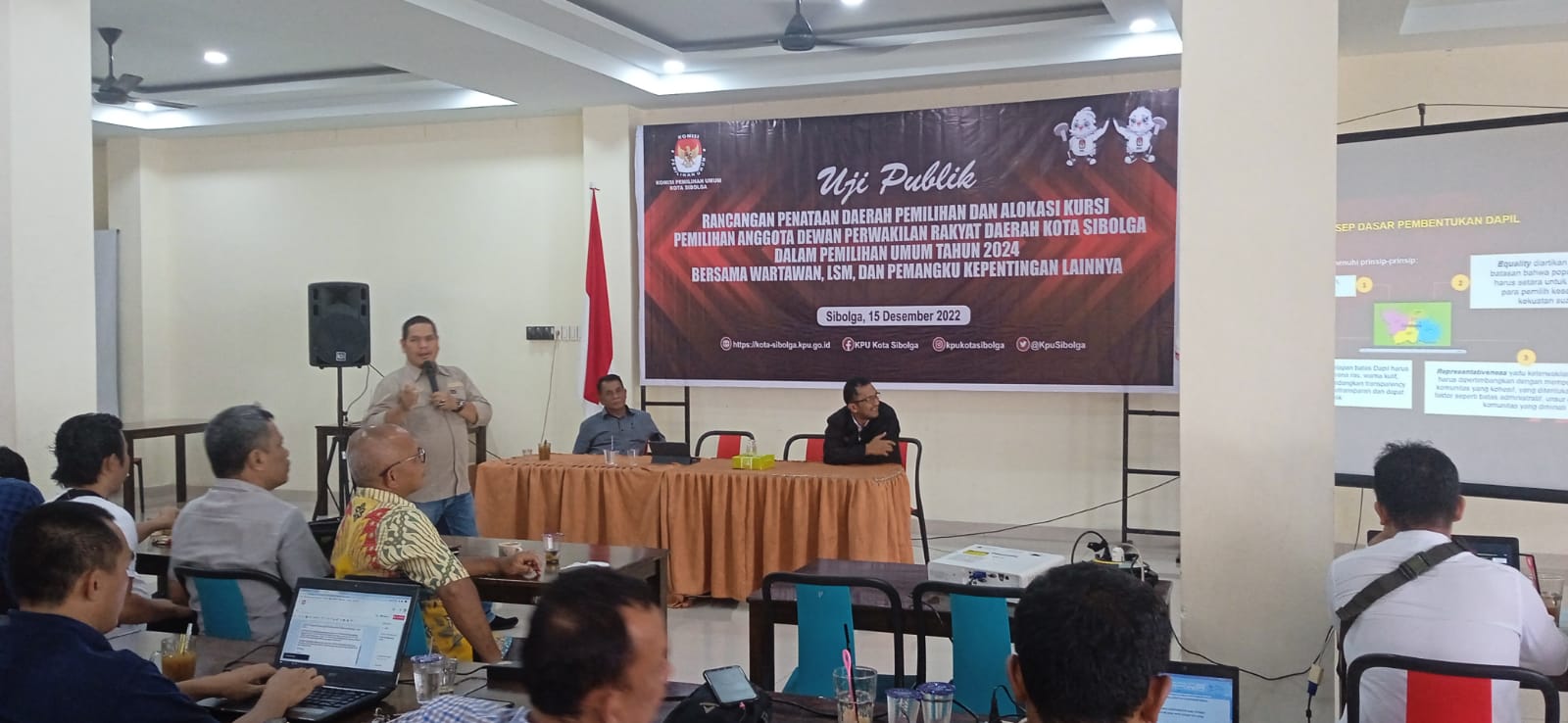 Komisi Pemilihan Umum (KPU) Kota Sibolga menggelar Uji Publik terkait Rancangan Penataan Daerah Pemilihan dan Alokasi Kursi Pemilihan Anggota DPRD Kota Sibolga dalam pemilihan umum Tahun 2024. Kamis (15/12/2022) di Jalan Diponegoro, Kelurahan Pasar Belakang, Kecamatan Sibolga kota, kota Sibolga