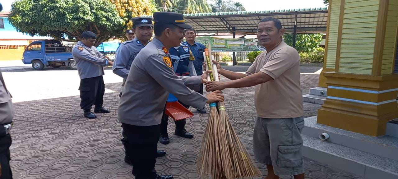 “Momen HUT Bhayangkara ke-77 Tahun 2023, saat ini kami dari Polsek Sorkam menggelar gotong-royong di Masjid Taqwa Muhammadiyah Kelurahan Sorkam,” ucap Kapolsek Sorkam AKP Edy Suranta