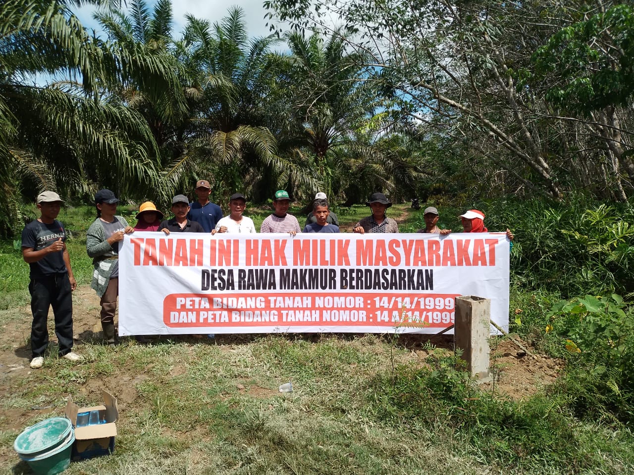 “Hari ini kami melakukan aksi pematokan batas wilayah Desa Rawa Makmur, sekaligus meminta kepada Ucok Gardon yang merupakan salah seorang pengusaha di Kabupaten Tapteng Sibolga agar mengembalikan hak tanah masyarakat yang telah diserobot nya,” terang R Hutagalung.
