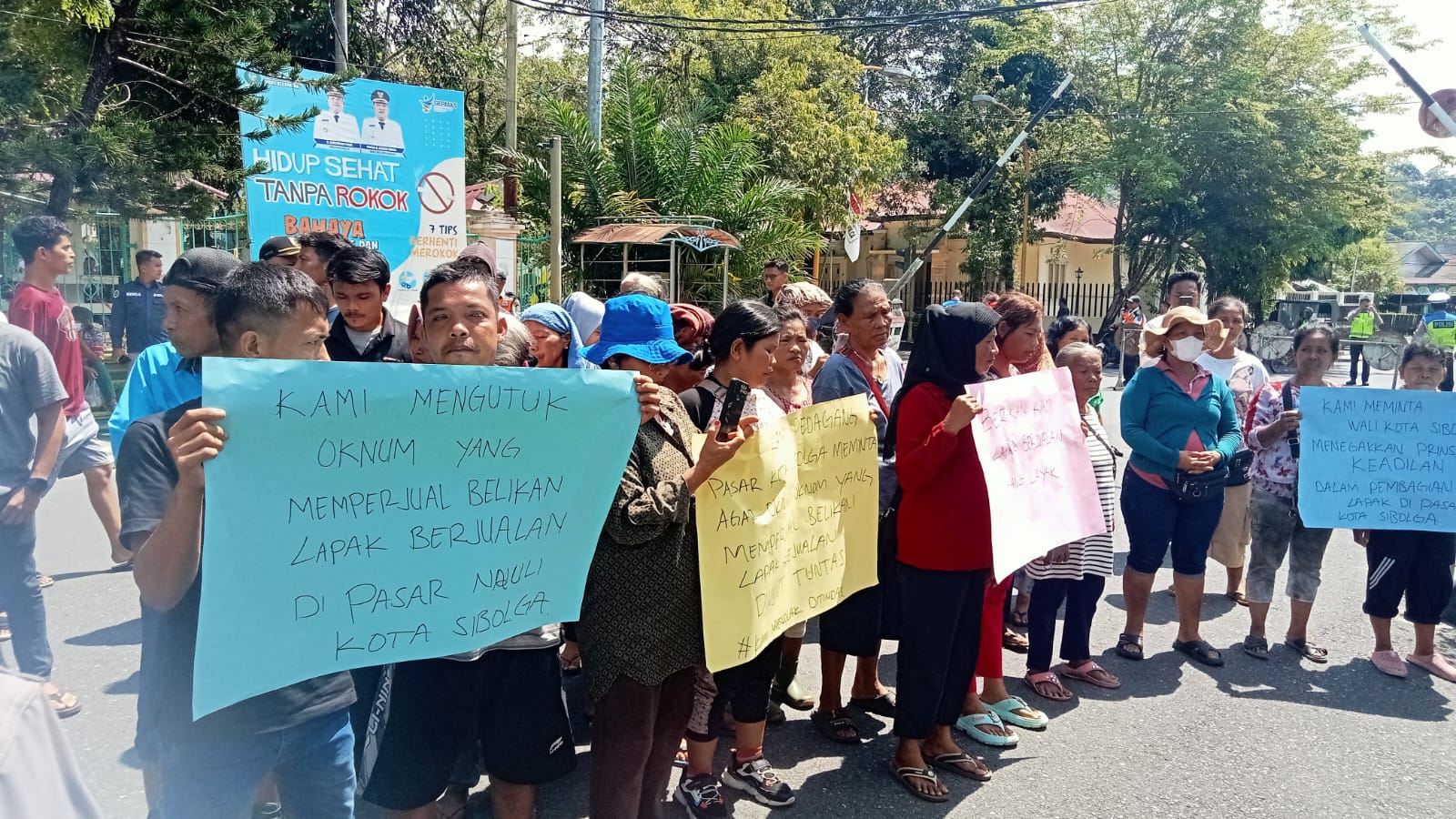 Puluhan ibu – ibu pedagang bersama aliansi mahasiswa dan pedagang kota Sibolga melakukan aksi unjuk rasa damai di kantor Walikota Sibolga, Rabu (07/02/2024).