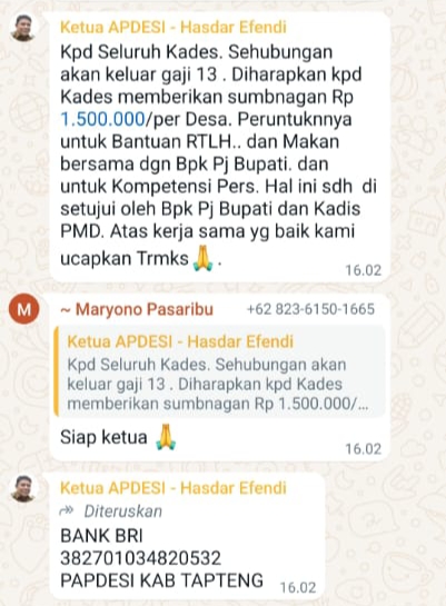 “Kpd Seluruh Kades. Sehubungan akan keluar gaji 13. Diharapkan kpd Kades memberikan sumbangan Rp1.500.000/desa. Peruntuknnya untuk Bantuan RTLH.. dan makan bersama dgn Bpk Pj Bupati. dan untuk Kompetensi Pers. Hal ini sdh di setujui oleh Bpk Pj Bupati. Atas kerja sama yg baik kami ucapkan trmks, tulis Ketua DPC P-APDESI Tapteng Efendi Pasaribu di grup WhatsApp