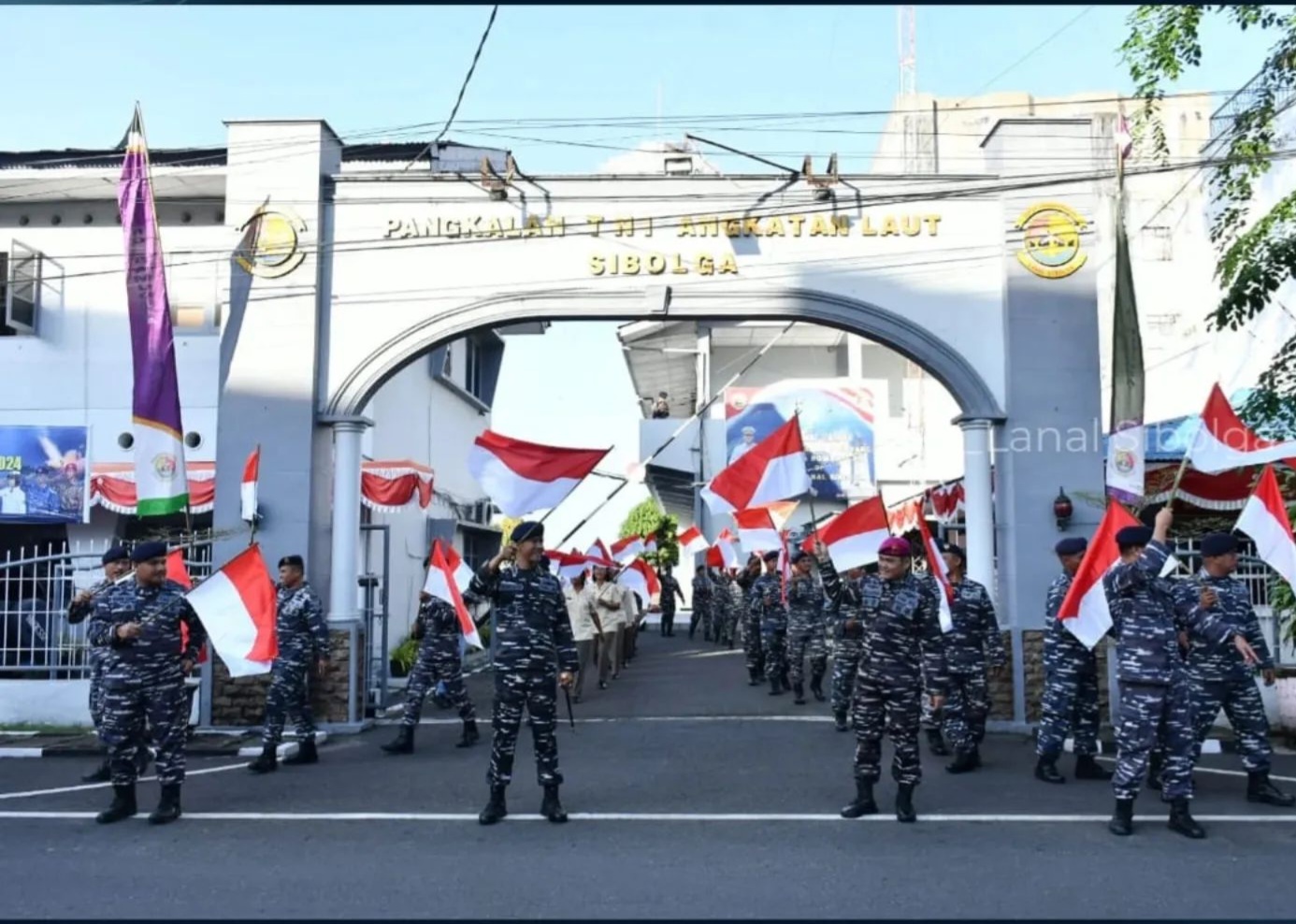 Amatan Dilapangan, Komandan Lanal Sibolga Letkol Laut (P) Robiyanto terlihat memimpin seluruh prajurit Benteng Samudra Perkasa Lanal Sibolga membagikan bendera dengan ukuran sedang sebanyak 79 buah dan bendera kecil sebanyak 100 buah di depan Mako Lanal Sibolga.(Rizki)