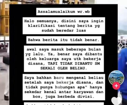 “Assalamualaikum wr wb. Halo semuanya, disini saya ingin klatifikasi trntang berita yang sudah beredar luas, bahwa berita itu tidak benar. Awal saya masuk (kerja) beberapa bulan lalu, ya benar saya dibantu oleh keluarga saya untuk bekerja disana, tapi tidak dibantu sama sekali oleh beliau. Saya bakan baru mengenal beliau setelah saya bekerja disana, dan tidak punya hubungan apa-apa hanya sekedar kenal karyawan dan bos, juga berbeda divisi. Bakan tidak ada bukti apa apa yang menunjukkan saya memiliki hubungan spesial dengan beliau. Dan kasus ini juga sedang ditangani oleh pihak keluarga saya karena termasuk pencemaran nama baik. Saya memohon maaf untuk semua pihak yang dirugikan, terima kasih” kata MA dalam postingannya, usai video viral menyebut dirinya kekasih dari Asmen Bagian Pemeliharaan PLN Indonesia Power, Alen Suryotomo.