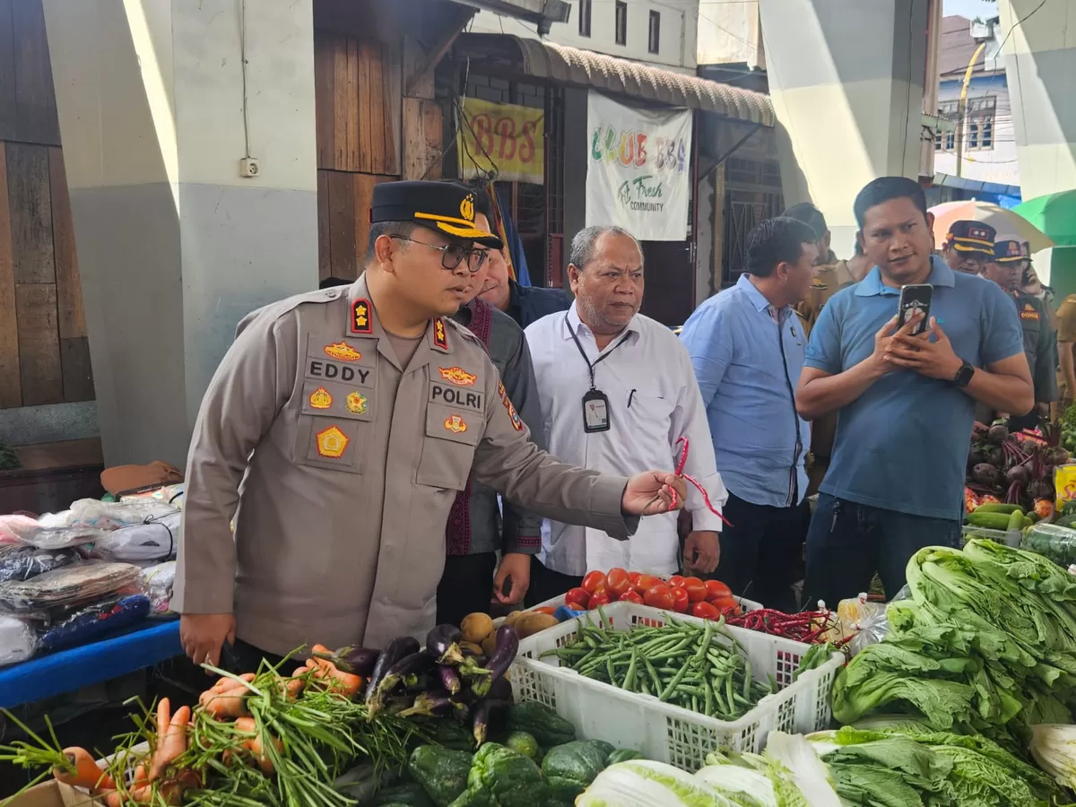 Kapolres bersama rombongan melakukan pengecekan langsung terhadap ketersediaan bahan pokok sekaligus berdialog dengan para pedagang guna mengetahui kondisi distribusi dan perkembangan harga di lapangan.